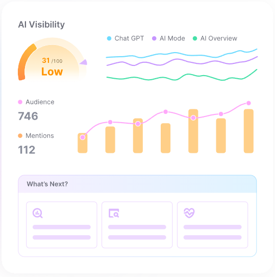 - Exemple : Score de 51/100 = “Medium” avec mention “Occasionally mentioned in LLM outputs, but Visibility can improve”