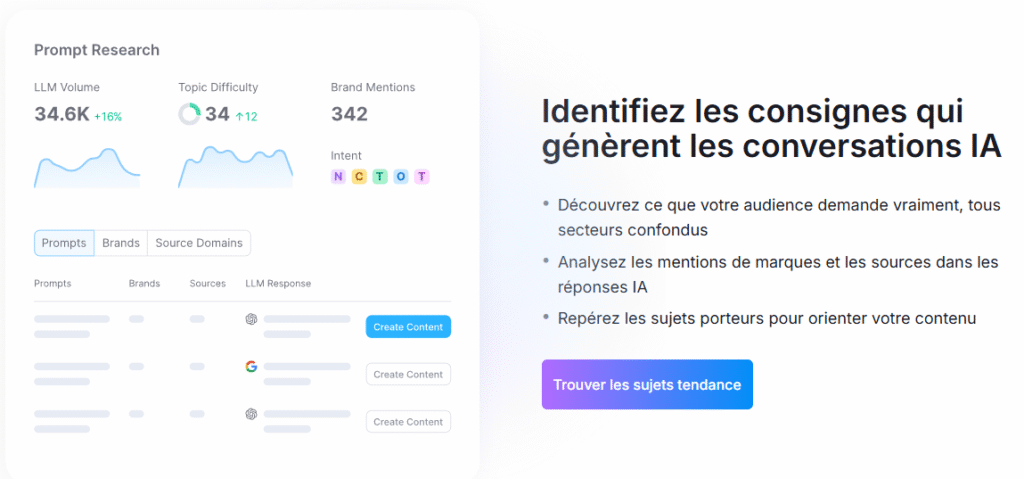| Monitoring | Surveillance de votre présence sur ChatGPT, Claude, AI Mode, Gemini | Visibilité complète sur votre “AI footprint” |