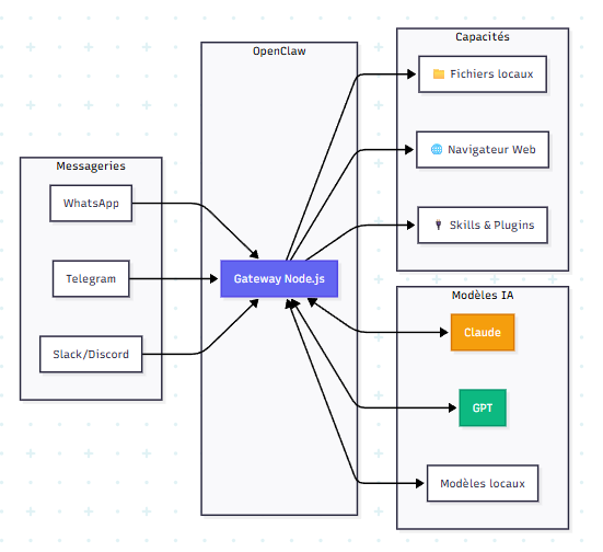 En résumé : OpenClaw fait le pont entre vos applications de messagerie quotidiennes et les capacités des LLM, tout en leur donnant accès à votre système.