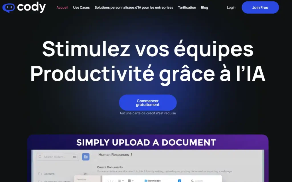 Cody est un assistant IA d’entreprise que vous formez sur vos propres données (PDF, PPT, Word, pages web, FAQ, SOP, Wiki…). Une fois entraîné, il répond aux questions métiers, cite ses sources, rédige des contenus (e-mails, procédures, textes marketing), assiste l’onboarding et peut s’intégrer où travaillent vos équipes (widget site, Slack, API…). L’objectif : réduire le temps de recherche, uniformiser les réponses et capitaliser sur votre savoir interne.