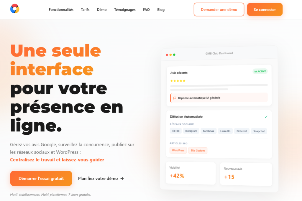 GMB Club centralise la gestion de vos avis Google, vos réseaux sociaux et votre SEO local depuis une seule plateforme pilotée par l’IA. Idéal pour les entreprises multi-établissements qui veulent automatiser leur e-réputation.