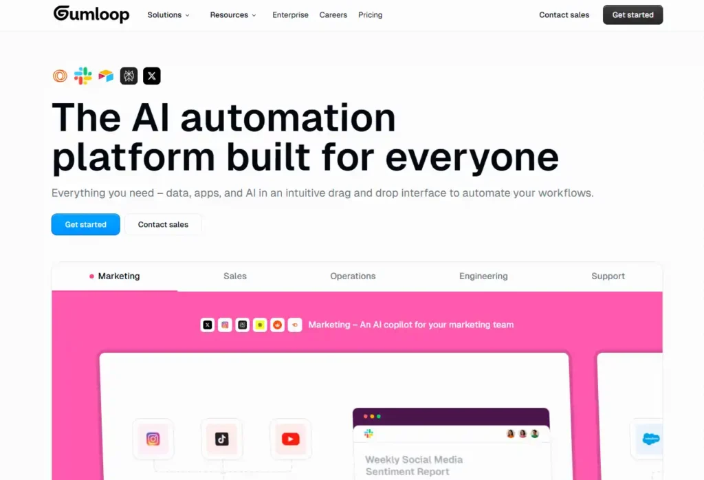 Gumloop est une plateforme d’automatisation “AI-first” qui permet de créer des workflows visuels et des agents capables de naviguer sur des sites, extraire/structurer des données, appeler des APIs, remplir des formulaires, générer des contenus et écrire dans vos outils (tableurs, CRM, Notion, Slack, etc.). Vous combinez des blocs IA (LLM, extraction, classification) avec des blocs d’action (navigateur, HTTP, fichiers, feuilles de calcul) pour industrialiser la prospection, la veille, le scraping propre, la génération de rapports et les opérations récurrentes — sans code (et avec code si besoin).