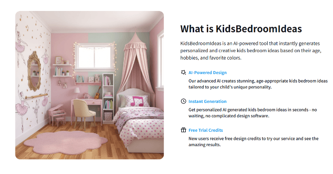 KidsBedroomIdeas est une application IA qui génère instantanément des designs de chambres d'enfants personnalisés selon l'âge, les loisirs et les couleurs préférées. L'outil propose des designs adaptés de bambins à adolescents avec résultats téléchargeables et partageables en quelques secondes. Il fonctionne avec un système de crédits incluant des crédits gratuits pour les nouveaux utilisateurs.