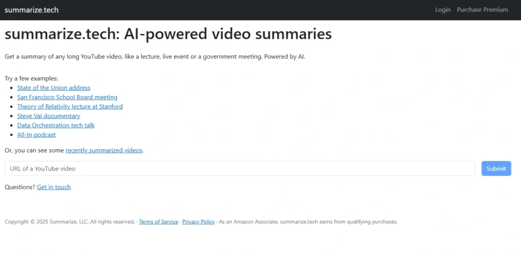 Summarize.tech est un service web IA qui génère automatiquement résumés concis de vidéos YouTube longues (conférences, événements live, réunions gouvernementales, podcasts, documentaires). Il suffit de fournir l'URL YouTube pour obtenir synthèse structurée des points clés sans visionner intégralement la vidéo.