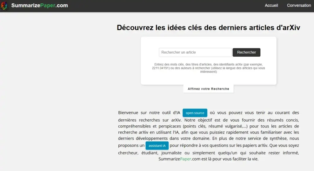 SummarizePaper.com est une plateforme open-source IA qui génère résumés automatiques d'articles de recherche arXiv. Elle combine synthèses concises, assistant chat conversationnel et recherche avancée booléenne pour faciliter accès aux dernières découvertes scientifiques dans tous les domaines académiques.
