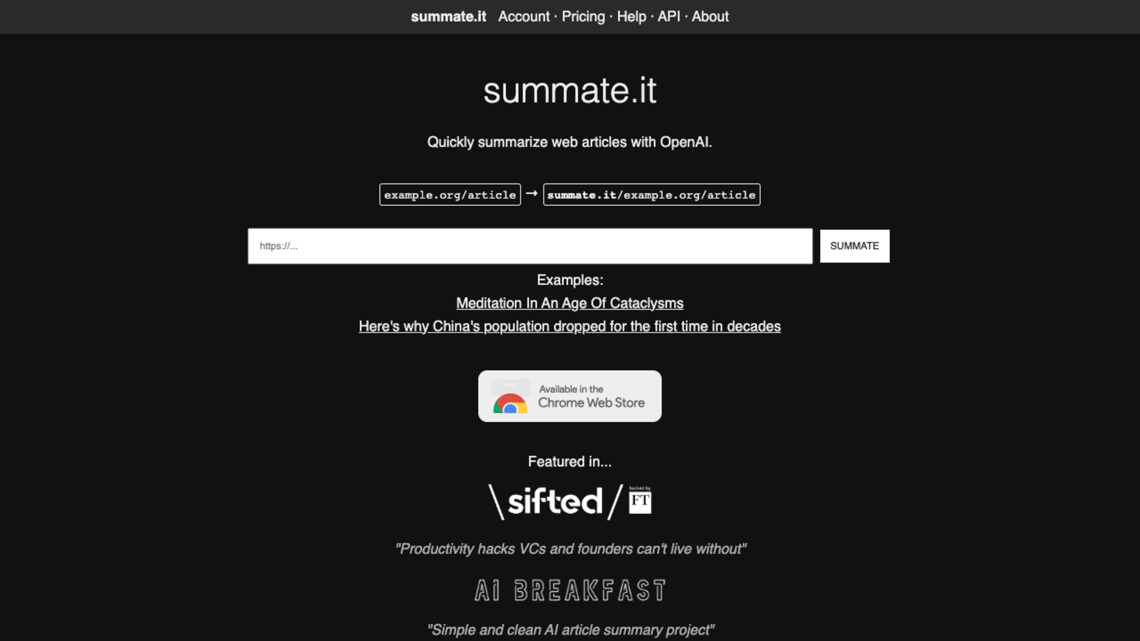 Summate.it est un service web de résumé d'articles propulsé par OpenAI qui condense rapidement contenus web longs en synthèses concises. Il fonctionne en préfixant simplement "summate.it/" devant n'importe quelle URL d'article. Développé par FiveFilters.org, il propose extension Chrome et design mobile responsive.