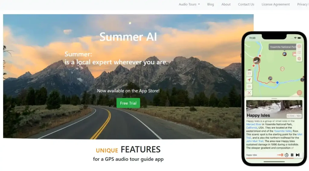 Summer AI est une application mobile de guide touristique audio propulsée par l'intelligence artificielle qui fournit des descriptions narratives des attractions, monuments et événements au fur et à mesure que les utilisateurs explorent de nouveaux lieux. Cette plateforme combine navigation GPS, réalité augmentée et narration IA pour transformer chaque exploration en expérience éducative et divertissante. Summer AI donne accès à des millions de points d'intérêt dans le monde entier, des grandes villes aux zones reculées, avec plusieurs personnalités IA (historien Bill, économiste Penny) offrant des perspectives variées. L'application propose également des résumés en temps réel d'événements locaux (concerts, marchés fermiers, lectures) et une navigation turn-by-turn pour rejoindre les attractions sélectionnées.