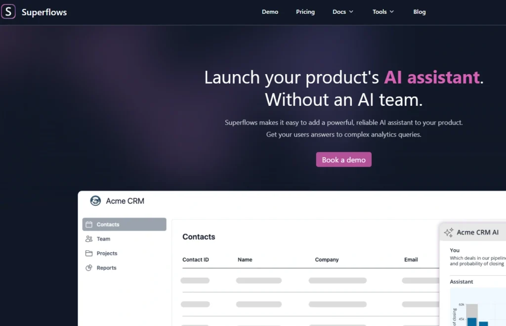 Superflows permet aux entreprises SaaS d’intégrer un assistant IA conversationnel directement dans leur produit, sans nécessiter d’équipe IA dédiée. En uploadant simplement votre spécification OpenAPI et votre documentation, Superflows génère automatiquement un assistant intelligent capable de répondre aux questions des utilisateurs, fournir des analytics instantanés et exécuter des actions dans votre produit.