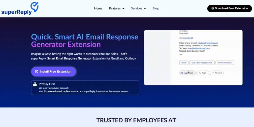 SuperReply est une extension Chrome propulsée par l'IA qui génère automatiquement des réponses emails professionnelles adaptées au contexte. Elle analyse chaque message reçu et propose instantanément trois options de réponse personnalisées parmi lesquelles choisir, éliminant la nécessité de rédiger depuis zéro. Compatible avec Gmail et Outlook, l'outil intègre personnalisation du ton, support multilingue, et assistance à la négociation, tout en garantissant confidentialité totale avec zéro stockage des données emails sur serveurs.