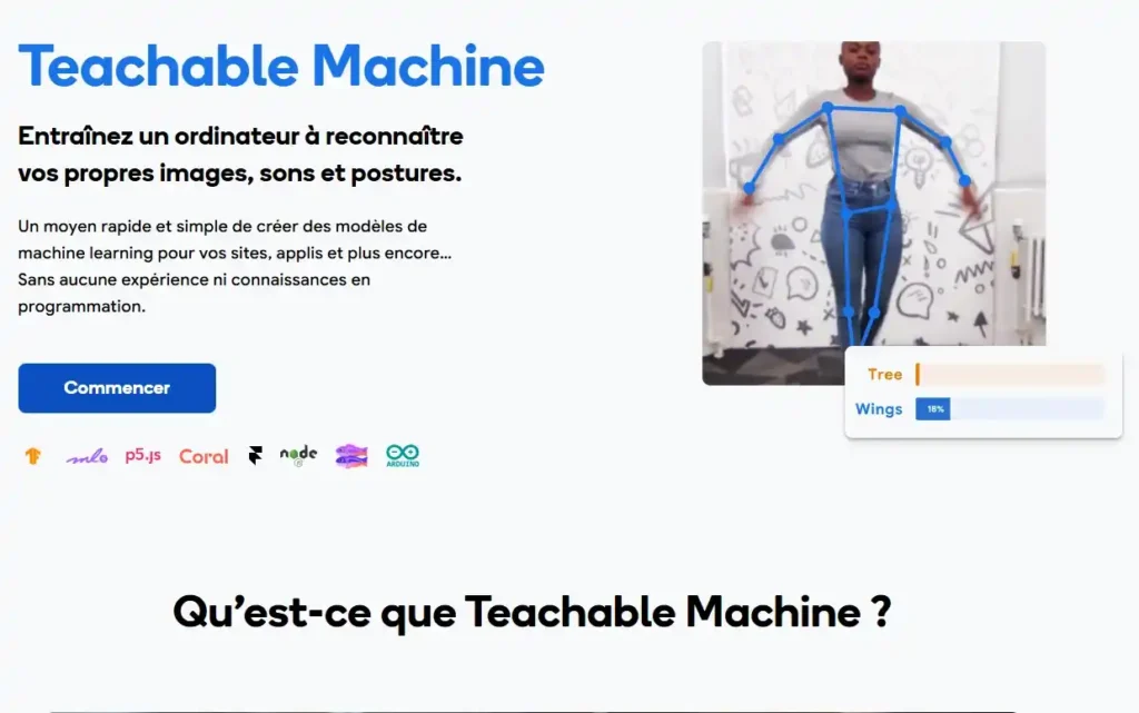 Teachable Machine est un outil gratuit développé par Google qui permet à tout le monde de créer des modèles d'apprentissage automatique personnalisés sans aucune connaissance en programmation. Grâce à une interface web intuitive, vous pouvez entraîner des modèles de reconnaissance d'images, de sons et de poses en quelques minutes seulement. Les modèles créés peuvent être exportés et intégrés directement dans vos sites web, applications mobiles ou projets créatifs.