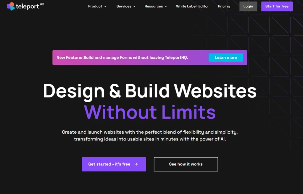 TeleportHQ est une plateforme low-code front-end combinant design visuel et génération code automatique pour créer applications web responsive sans coder manuellement. Interface drag-and-drop permet designers et développeurs construire interfaces interactives, exporter code production-ready React, Vue, HTML/CSS instantanément.
