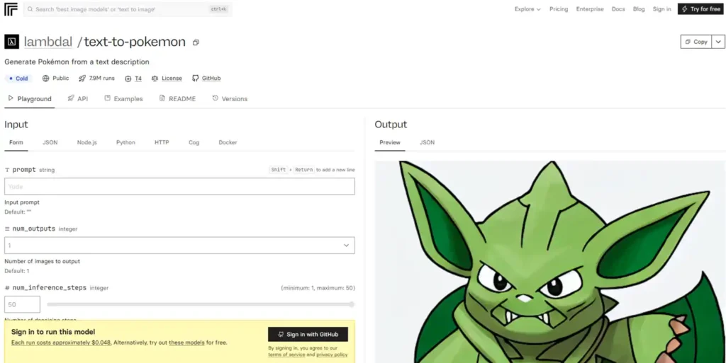 Non, Text To Pokemon fonctionne sur un modèle payant à l'usage sur Replicate à 0,048 $ par génération. Vous pouvez cependant le déployer gratuitement en local si vous avez votre propre GPU.