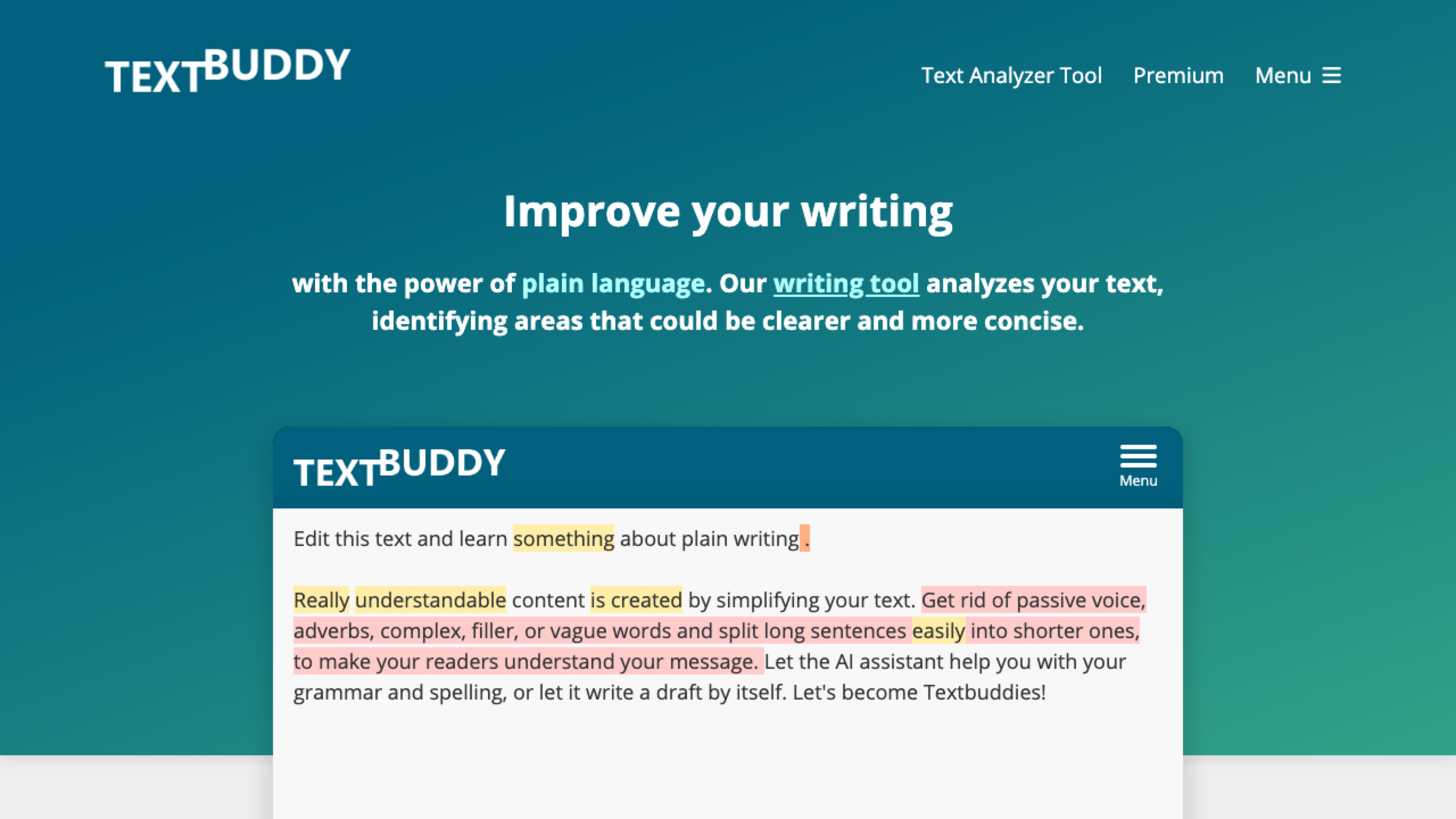 TextBuddy est un éditeur de texte en ligne qui combine analyse d’écriture et réécriture IA pour améliorer la clarté et la concision de vos contenus. Alimenté par ChatGPT-4, il identifie les phrases trop longues, les mots complexes, les répétitions, la voix passive et le langage vague, puis propose des réécritures en langage simple. Avec scores de lisibilité, niveaux CEFR, compteurs de mots et support de 50+ langues, TextBuddy aide étudiants, créateurs de contenu, tuteurs et professionnels à produire des textes clairs pour audiences globales.